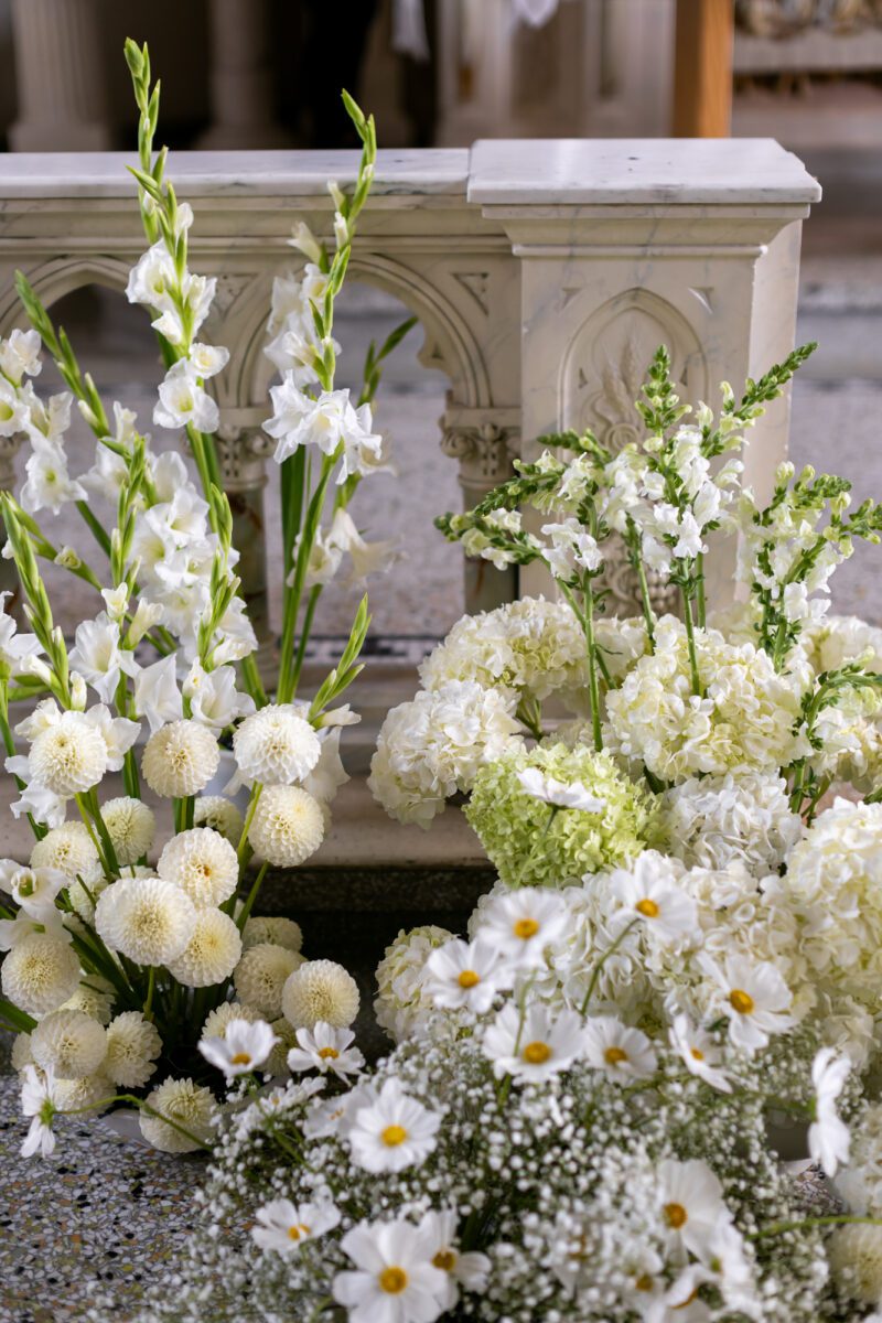 Guests entered the arched doorway complete with an abstract arrangement of cream hydrangeas arranged by Norther World, and saw them out on the steps outside with ribbons in hand. As the getaway car with Tess & Tristan headed back to Seattle Tennis club to get on a boat for a quick ride around Lake Washington, we also headed back to get a head start on reception detail photos.